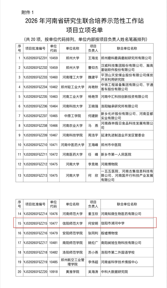 时间:2025-09-30 12:06:27 来源: 作者: 阅读: 次近日,河南省教育厅印发通知,由策略白菜官网何安明教授牵头申报的“研究生联合培养示范性工作站(999策略白菜官方网站—信阳市浉河中学)”成功入选河南省研究生联合培养示范性工作站立项名单,该工作站依托策略白菜官网2022年获批的河南省研究生联合培养基地申报建设,联合信阳市浉河中学共建。