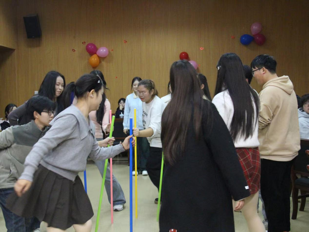 活动筹备阶段,工作人员精心布置场地,为全体成员打造了温馨舒适的活动环境。活动伊始,学生会主席韦天晨发表开场致词。他首先对全体成员的辛勤付出表示感谢,随后详细介绍本次联谊会的活动目的与流程。随后,开场舞活力上演,迅速调动现场氛围,学生代表献唱暖场歌曲,进一步凝聚全场的活动热情。游戏环节“确认眼神”“不能说的秘密”“不倒森林”“真假抛球”等各种兼具趣味性与协作性的游戏依次开展,参与者们默契配合、积极互动,在欢声笑语中增进了对彼此的了解和信任。